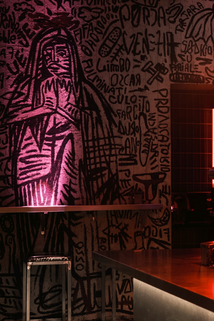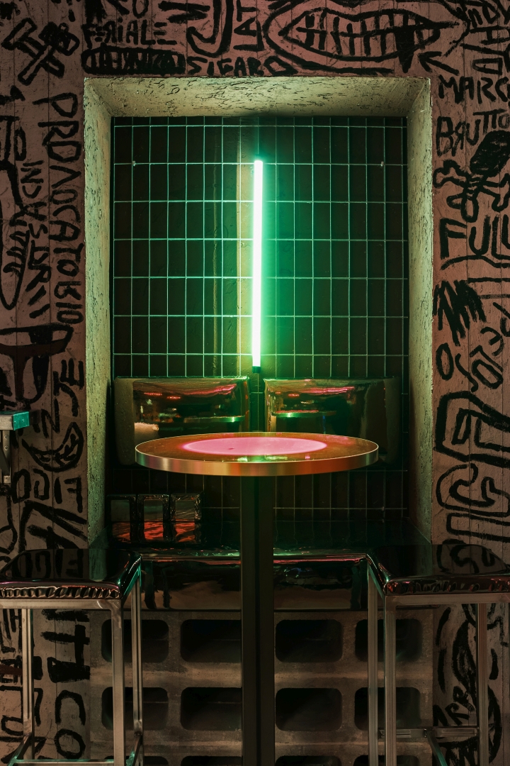 Nick Maltese designs the interiors of a venue focused on straightforwardness, presenting itself as an alternative to conventional nightlife. Partners Mario Farulla, Gigi Tuzzi, and Carola Abate collaboratively developed the concept, aiming to strip away unnecessary elements that detract from the essence of enjoyment. Their approach aligns with countercultural movements, offering a concise drink menu featuring house-made concoctions and classic cocktails, paired with a late-night food menu featuring provocative dishes. Nick Maltese Studio crafts visually striking interiors inspired by Brutalism, incorporating graphic elements reminiscent of Basquiat's artwork. The bar counter, adorned with stylized penises, adds a playful touch. Service at Dirty prioritizes guest engagement over traditional measures, with a focus on spontaneity. Operating from 7:00 p.m. to 4:00 a.m., Dirty caters to post-clubbers and night workers, dividing its space into two sections for varying levels of privacy. Despite its exclusivity, Dirty operates on a first-come, first-served basis. A diverse soundtrack complements the atmosphere, ranging from 90s/2000s hip-hop to experimental sounds.