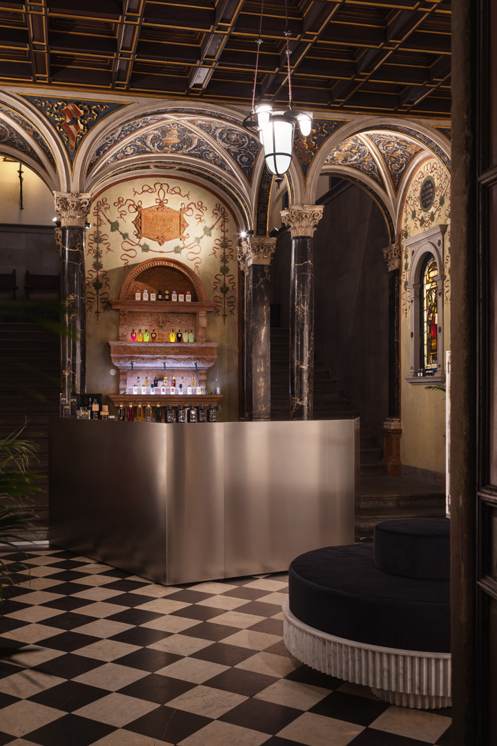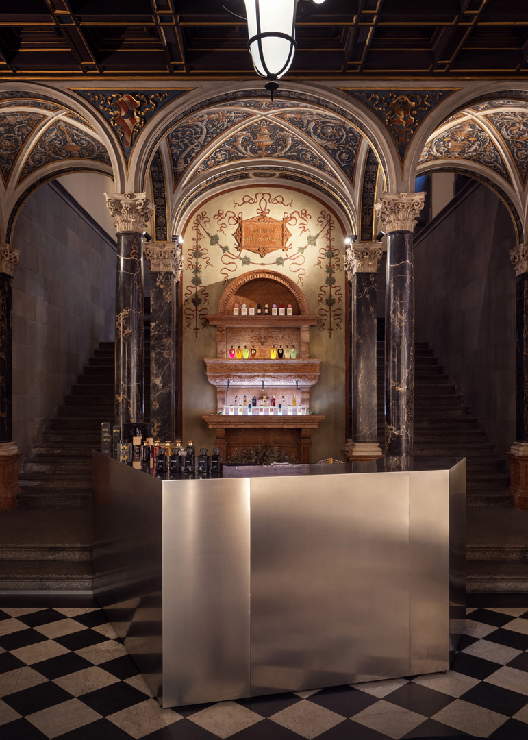 A Milano, nelle storiche sale di Palazzo Bagatti-Valsecchi, nasce una boutique del profumo super elegante in cui il linguaggio minimalista sui generis dei progettisti trova inaspettate risonanze con il contesto neo rinascimentale. Novità straordinaria a Palazzo Bagatti Valsecchi, presenza storico-culturale nodale nel Quadrilatero della Moda milanese. In uno dei club english style più esclusivi del capoluogo lombardo insediato nelle sale che furono la casa show-room dello stilista Rocco Barocco, prende infatti il via un nuovo progetto che esplora in modo immersivo il mondo dei profumi di altissima gamma proponendo una concept-boutique innovativa dal forte impatto emozionale. Si chiama “Art Parfums Milano”, ideato, su sollecitazione di uno dei massimi “nasi” oggi in circolazione e basato sul solido senso della narrazione e una ricercata, ironica sensibilità per la contaminazione storico-stilistica di NICK MALTESE STUDIO. Qui, nell’architettare una boutique-installazione incastonata in un contesto storico e storicamente significativo qual è appunto il Bagatti-Valsecchi, Maltese e Pagetti si sono trovati ad affrontare una sfida insolita e sfaccettata. In primis trovare una sintesi esteticamente efficace nel contrasto tra un contenitore storicista che, attraverso il sentimento tardoromantico tipico di fine Ottocento, rilegge la cultura abitativa del Rinascimento, e la volontà di creare al suo interno una scena, un contenuto marcatamente minimal e contemporaneo, con una vena di trasgressione stilistica. Spiega Nick Maltese: “La sala e il mezzanino affidatici per mettere in pratica il progetto costituivano per definizione una cornice tanto magniloquente quanto intoccabile con una loggia ‘domestica’, colonne, scaloni, un grande camino e un pavimento a scacchi bianchi e neri. Per l’interior che avevamo in mente, una specie di interno di navicella spaziale dal vago sapore rock, occorreva dunque ideare un linguaggio che enfatizzasse e mettesse in armonia le qualità dei due poli in questione, il presente e il passato, evitando che uno soverchiasse o interferisse con l’altro. Risolte le questioni tecniche e di sicurezza in collaborazione con il Direttore del Museo e la Direttrice tecnica, abbiamo lavorato su un concept che privilegia forme spigolose e materiali specchianti capaci di riflettere e quindi moltiplicare percettivamente e insieme mescolare visivamente gli elementi della scena, così da avviluppare il visitatore in una magia di stupore quasi barocca. Abbiamo puntato a dar corpo a un’esperienza multisensoriale – in cui l’ olfatto occupa un posto di rilievo – che non rinuncia completa mente al decoro e tuttavia mira a esaltare la mate ria grezza in un nuovo modello estetico puro e intenso.” Tutti custom made e disegnati ad hoc, gli arredi, il desk, il grande puff centrale in marmo calacatta disegnato da Nick Maltese Studio in collaborazione con Marmi Fuda, i tavolini, gli shopper, la piantana, tra loro in perfetta sintonia estetica, sfoggiano linee petrose, pungenti, di carattere e sono realizzati in acciaio spazzolato e vetro fumè. Gli espositori e i totem espositivi retro illuminati sono tra i punti focali dell’intervento: nell’aspetto rendono omaggio allo skyline della nuova Milano dei grattacieli, al suo incrocio di forme slanciate e di riposanti, ritmiche orizzontalità, disegnano una sorta di città simbolica ed esibiscono, sotto il profilo materico, un’ordinata giustapposizione di acciaio spazzolato, e vetro. Linee spigolose, riflessioni, contrasti sono le linee guida che hanno guidato lo Studio a creare un eccellente progetto che stupisce e mai finisce di incuriosire, in cui tutto concorre a ribadire la centralità del profumo nell’odierno concetto di lusso e di eleganza