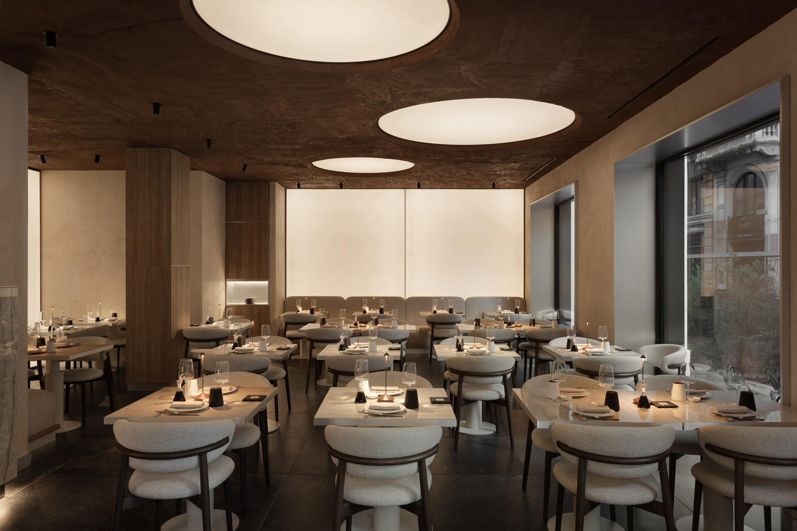 A Milano, in via Lazzaro Palazzi, si afferma un nuovo classico della cucina giapponese. L’interior design ideato da Nick Maltese e Fede Pagetti di Nick Maltese Studio accompagna esperienze gustative straordinarie creando una scena intima e meditativa a contrasto con la caotica dinamicità commerciale della zona. Per un classico della cucina giapponese che se ne va, il leggendario Endo il primo ristorante nipponico a sbarcare a Milano nel 1968, eccone un altro che apre, in via Lazzaro Palazzi 6, l’arteria milanese vocata alla gastronomia etnica. Si chiama Sushi Sato Experience ed è davvero già un classico. Con i suoi sapori nitidi, in purezza, con i suoi sceltissimi ingredienti, è una finestra impareggiabile e squisita sulla cultura culinaria, e non solo, del Sol Levante. A rendere ancor più esaltante l’esperienza gustativa è la scena architettonica intima e rarefatta studiata. Due maestri nel trasferire sul piano decorativo i caratteri dello Zeitgeist contemporaneo giapponese, come testimoniano i molti locali, tutti diversi tra loro, allestiti su questo tema in varie località italiane. L’idea è stata quella di creare un ambiente che contrastasse l’ansiogena dinamicità metropolitana, che si manifesta a pochi passi dal locale, nel formicolante corso Buenos Aires. Si è puntato su una progettazione molto materica e altrettanto essenziale per fomentare un’atmosfera di serenità e naturalezza che desse modo ai commensali di vivere un’esperienza sensoriale unica, fatta di quiete e riflessione, senza stimoli distraenti, concentrata sulla bontà dei piatti”. All’esterno, sulla via, Sato si presenta con grandi vetrine riquadrate di nero che incorniciano la sala come fossero dei tab leaux vivants in perenne trasformazione con gli ospiti attori che mutano di continuo, metafora animata della ruota della vita. Un respiro teatrale in una cortina stradale caoticamente affollata di insegne sgarbate, di negozi di ogni genere e di ristoranti di una moltitudine di nazionalità. Varcata la soglia ci si sente avvolti da un’aura di tutt’altro tipo, intima e preziosa, come sospesa, evocata dai materiali naturali, dalla semplicità delle forme, dalla discrezione soffusa dell’illuminazione. Protagonisti degli interni sono il legno di ciliegio con i suoi toni caldi, dorato-rossastri, i rivestimenti murari in argilla naturale – un’eccellente proposta Novacolor che sottolinea i criteri di sostenibilità con cui è stato redatto il progetto–, e gli innovativi moduli luminosi molto “Japanese style” realizzati con tessuto di Dresswall che richiama la carta di riso in uso nelle case nipponiche e diffonde la luce in maniera uniforme, quasi setosa. Il centro della scena è presidiato da un bancone statuario eseguito in marmo con inserti specchianti alla base: è la materica introduzione allo spazio nel quale avviene la preparazione a vista di sushi, sashimi, nigiri e altro an cora, con la presenza della teppanyaki, una piastra rovente per la cottura al momento di funghi, verdure, gamberi e frutti di mare, carni e germogli di soia. Un perfetto mix di funzionalità ed estetica. Alle sue spalle, conclude questo palcoscenico gastronomico un setto in legno di ciliegio esteso fino al soffitto a creare una scenografia che guida lo sguardo verso l’alto. Verso il soffitto cui superficie, lavorata come una corteccia naturale, diventa a sua volta una scultura animata da grandi cerchi luminosi: una riuscita espressione di un’estetica neonaturalistica. Come fuori dal tempo. Anche l’arredamento, molto ritmato, contribuisce a conferire al ristorante un’aura ordinata e rilassante. Le sedute con schienale arcuato, avvolgente sono in legno habillé con cotone grezzo, i tavoli, disegnati ad hoc dallo studio, hanno il top di marmo e di essenze chiare in piena coerenza stilistica con il global concept del locale. I materiali e colori sfumati, la presenza di elementi naturali, l’orientamento degli arredi invitano a un’esperienza allineata ai princìpi del Feng Shui, per i quali ogni dettaglio è una sorta di consiglio a vivere lentamente per assaporare appieno il momento.