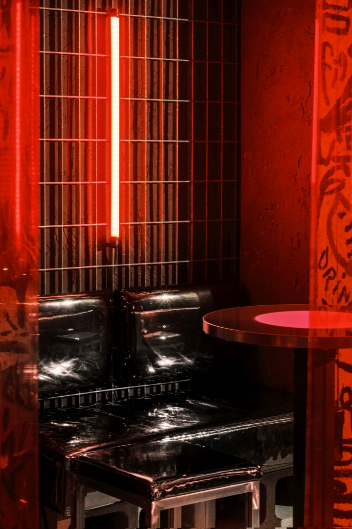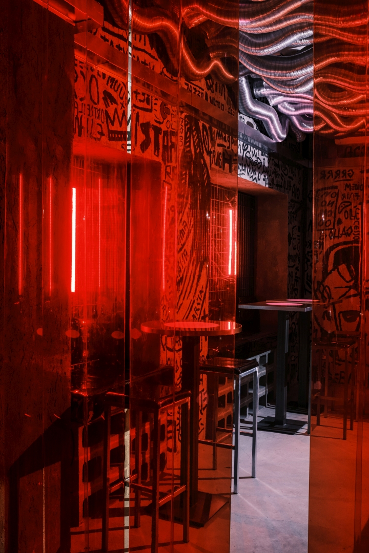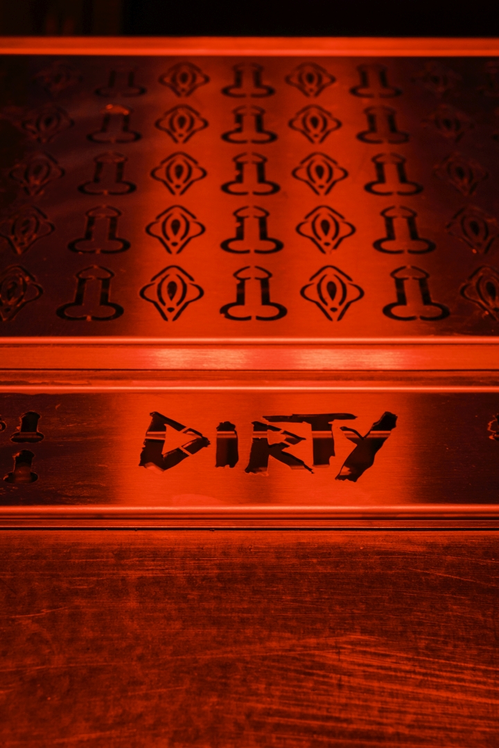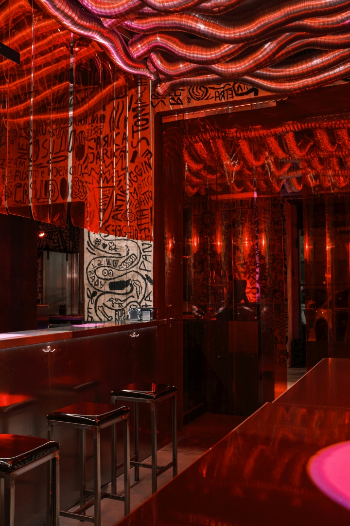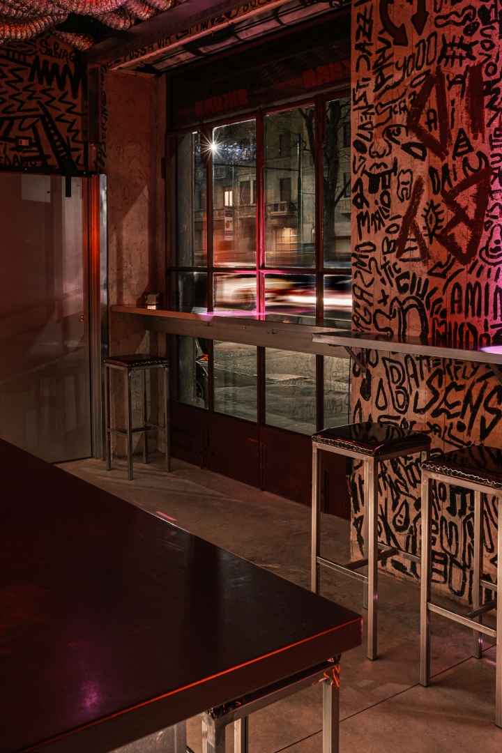 Nick Maltese designs the interiors of a venue focused on straightforwardness, presenting itself as an alternative to conventional nightlife. Partners Mario Farulla, Gigi Tuzzi, and Carola Abate collaboratively developed the concept, aiming to strip away unnecessary elements that detract from the essence of enjoyment. Their approach aligns with countercultural movements, offering a concise drink menu featuring house-made concoctions and classic cocktails, paired with a late-night food menu featuring provocative dishes. Nick Maltese Studio crafts visually striking interiors inspired by Brutalism, incorporating graphic elements reminiscent of Basquiat's artwork. The bar counter, adorned with stylized penises, adds a playful touch. Service at Dirty prioritizes guest engagement over traditional measures, with a focus on spontaneity. Operating from 7:00 p.m. to 4:00 a.m., Dirty caters to post-clubbers and night workers, dividing its space into two sections for varying levels of privacy. Despite its exclusivity, Dirty operates on a first-come, first-served basis. A diverse soundtrack complements the atmosphere, ranging from 90s/2000s hip-hop to experimental sounds.